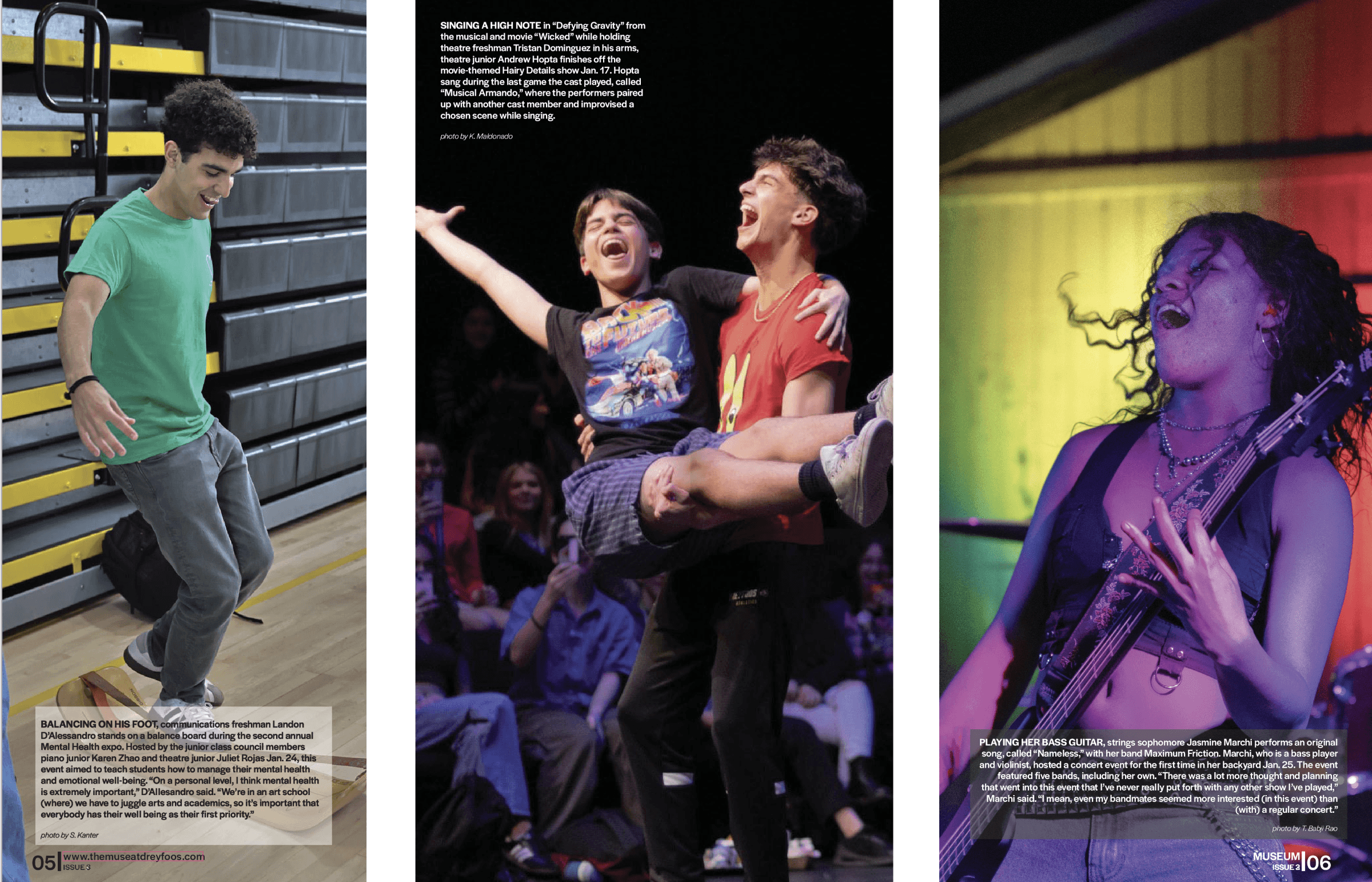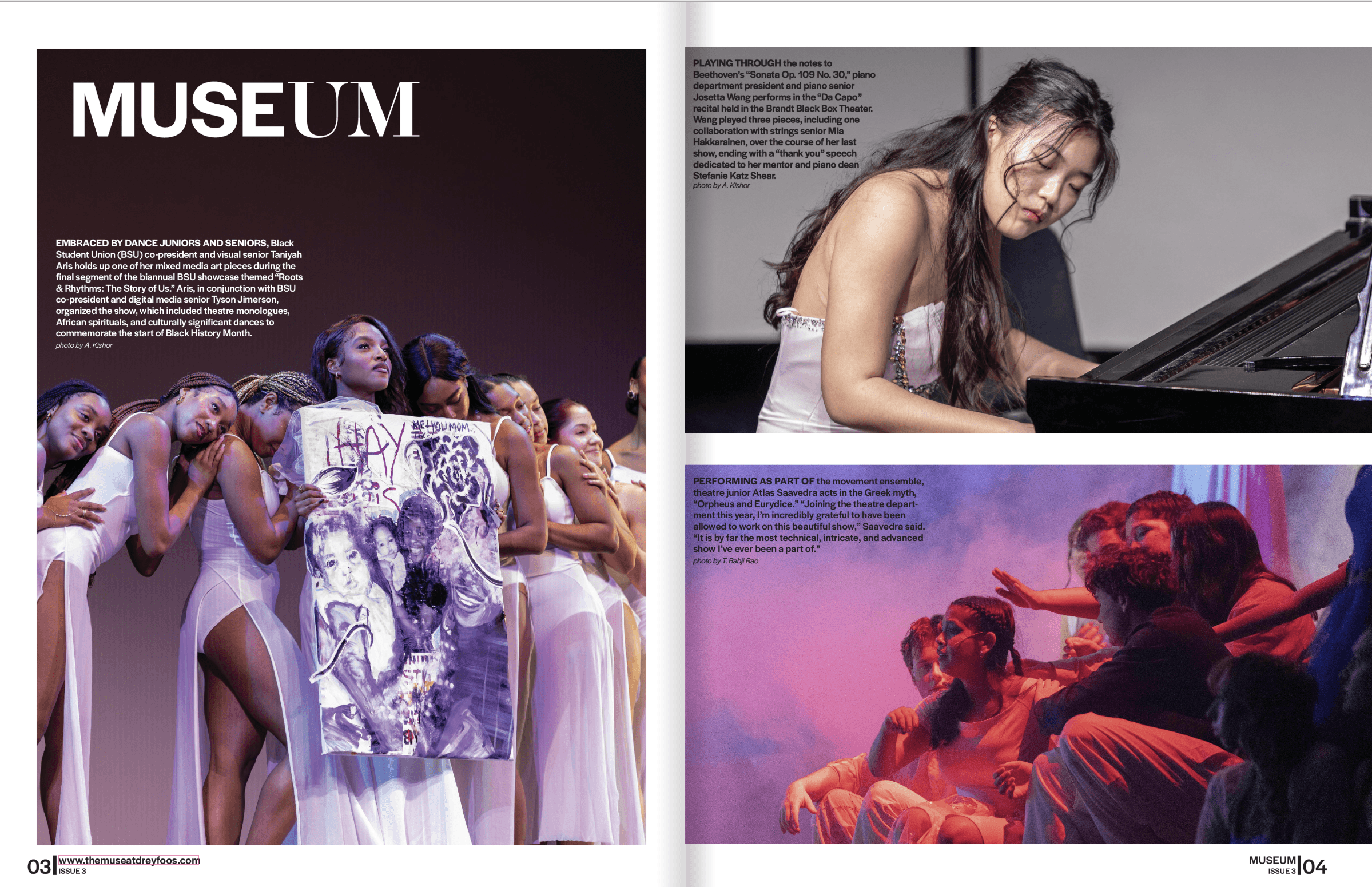 The Front of Book (also known as MUSEum) photo gallery is a compilation of photos taken by staffers during the quarter that have not been featured in any other stories. My co-photo editor and I select the 4-6 photos that are used and, being in the first few pages of the issue, therefore set a precedent for the rest of the issue. When selecting, I try to make sure that the photos are a reflection of the demographics at our school by varying the type of subjects featured, whether it be by major, gender, or race. I also try to select photos that feature a variety of types of events to avoid repetition and expose the student body reading the issues to events that are important to different groups of students.
